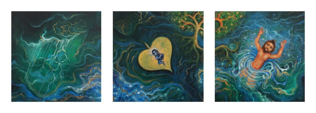 This is a painting I finally finished after chipping away at for a few years. It is inspired by the pastime of Mārkaṇḍeya Rishi’s vision of Maya – the illusionary energy of divinity and the destructive force of the pralaya as described in the Śrīmad Bhāgavatam. I love the cosmic nature of this pastime, finding the conceptual layers of the narrative valuable in image making, expressing the fluid nature of our perceived reality.